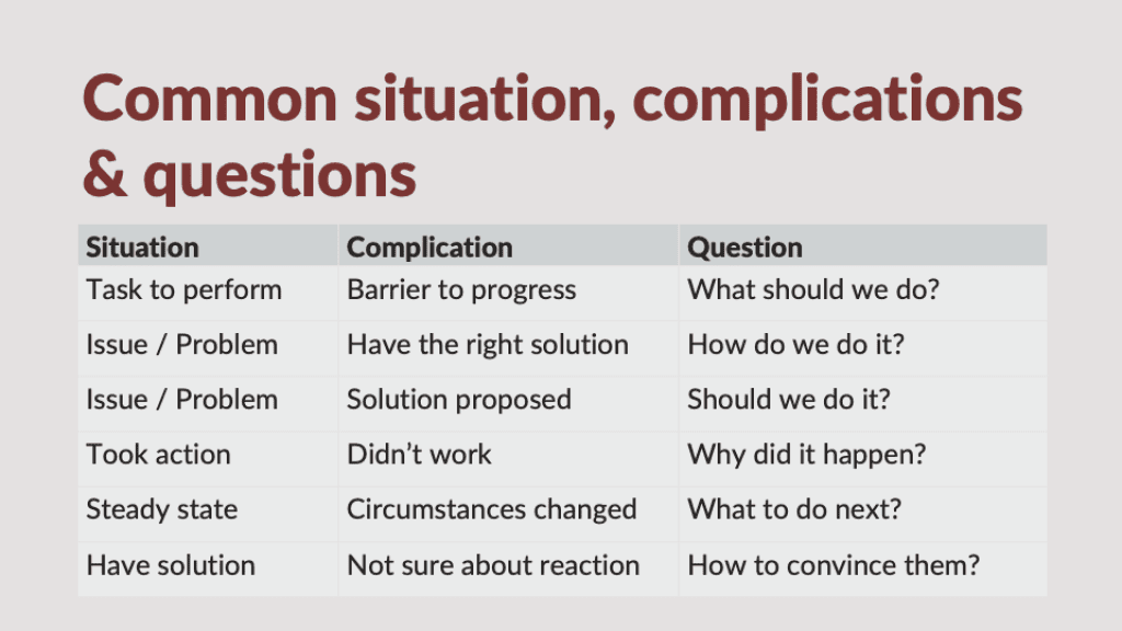 Using the SCQA framework in your presentation is about shaping your underlying problems and hypotheses that drive the work. In the SCQA model, the Situation and Complication help you define the context and the challenges at hand.