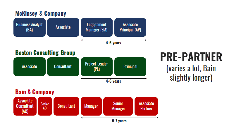 Overall the career paths at Bain, BCG and McKinsey are fairly similar and there are three distinct phases before making it to partner.