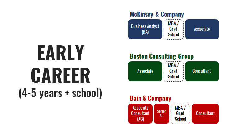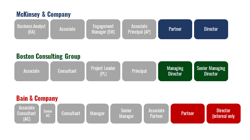 What are the career paths and titles at McKinsey, Bain, and Boston Consulting Group?