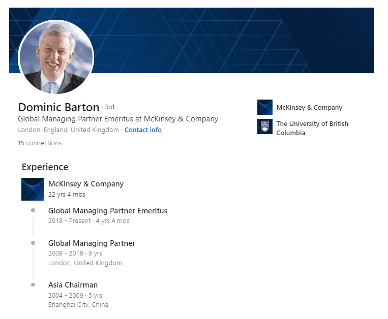 At each of the firms, this person is typically elected to a multi-year “term” by the other Partners and can be re-elected multiple times. A good example of a trajectory of a Partner is Dominic Barton at McKinsey. He went from the head of the Korean office, to the head of Asia, to the head of the entire firm for nine years.