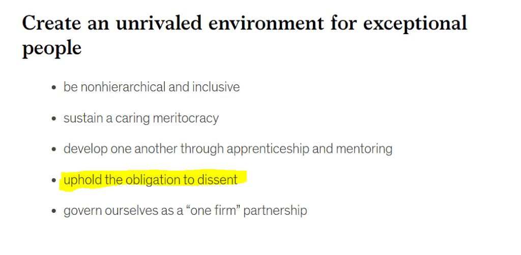 At McKinsey, this is reinforced through a core value: “the obligation to dissent.” While many firms have similar intentions, at McKinsey it is part of the day-to-day lived culture. Over and over again, people have seen the benefits of fully committing to the creative process and have trust that the process works. This is why Senior Partners often will ask the most junior people on the team what they think and really want to know.