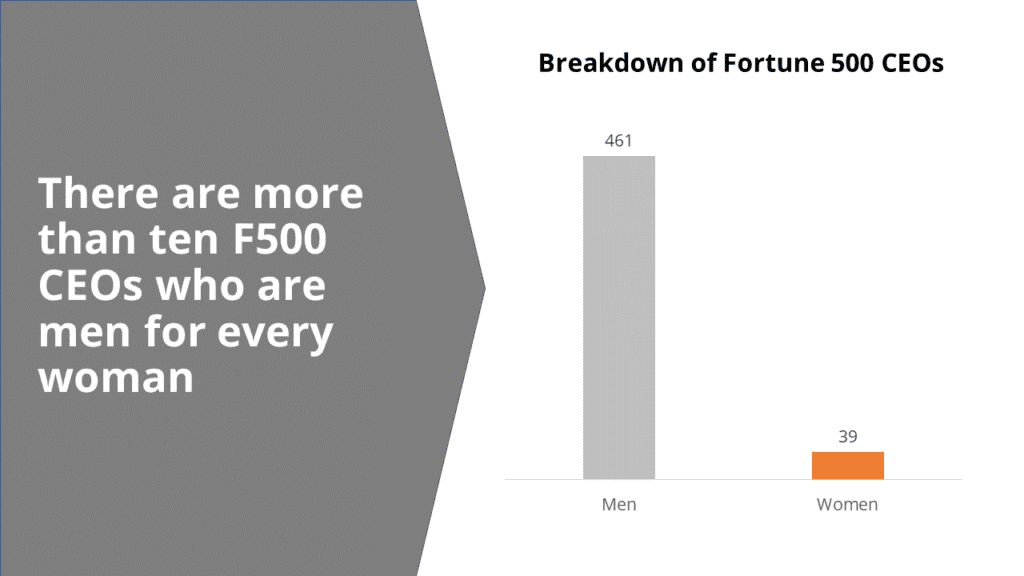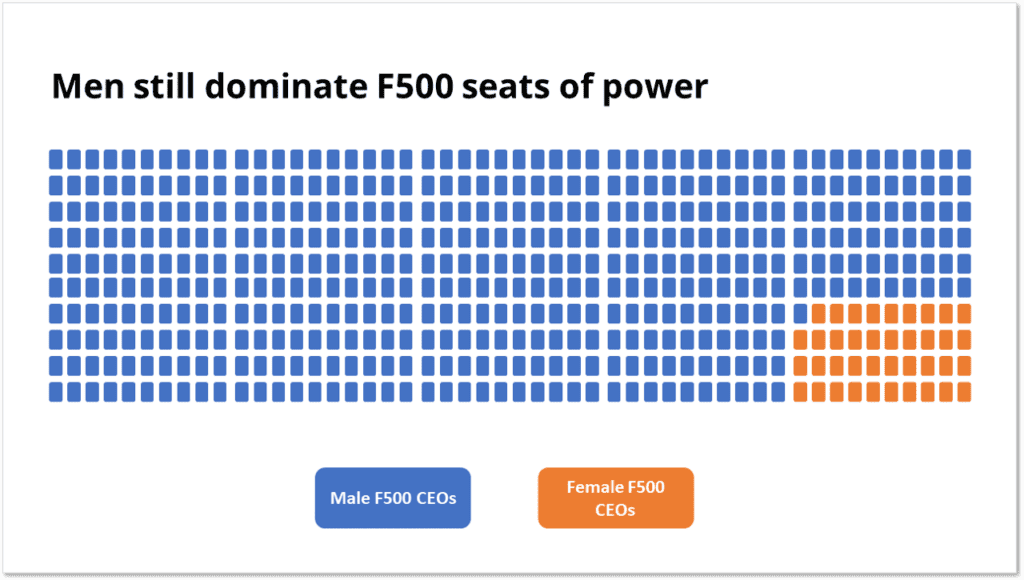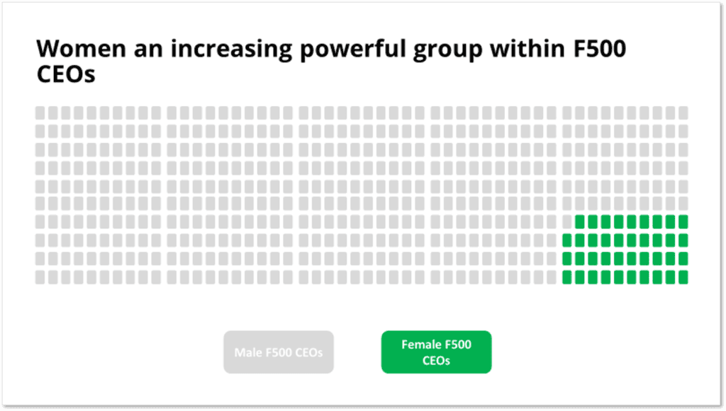 This slide is similar to the first one except it has a block for every single CEO. This still shows a relatively small number of women CEOs but because each one has a block it may not feel as vast a gap as the first slide.