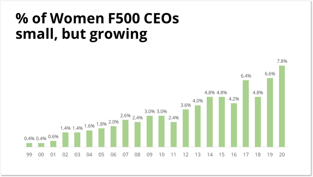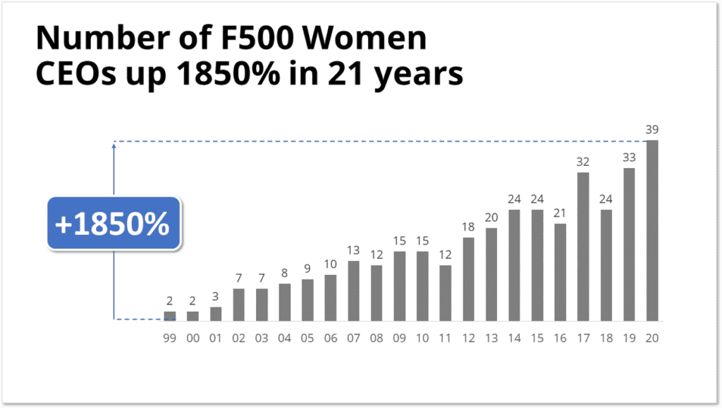 In this one we ignore the number of men and only highlight on the number of women who have become CEOs over time. This one shows a positive trend and might be used if you are trying to convey a hopeful message or argue against people saying there has not been progress made.
